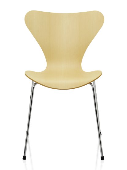 ...Schließlich doch gab Arne Jacobsen Fritz Hansens Wunsch nach und entwarf einen vierbeinigen Stuhl, die sogenannte Serie 7... 1955 auf den Markt gebracht, besteht der Serie 7 Stuhl aus einer schichtverleimten, formgepressten Messerfurnier-Sitzschale, die zwar nicht so eine beeindruckende Form wie der Ameisen Stuhl hat, dafür aber etwas größer und damit länger komfortabel ist...