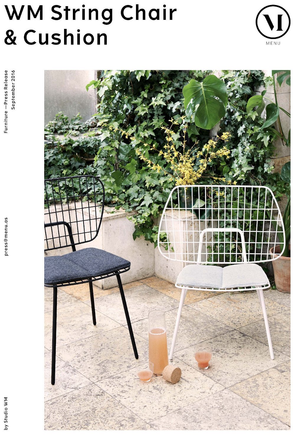 Die WM String Cushions von Audo Copenhagen (vormals Menu) ergänzen den gleichnamigen Dining und Lounge Chair des Designerduos Studio WM um ein bequemes Accessoire. Die gedeckten Farbtöne der Sitzkissen sind zeitlos, passen sich jedem Interieur an und sind in der Outdoor Variante ebenso für den Außenbereich nutzbar.
