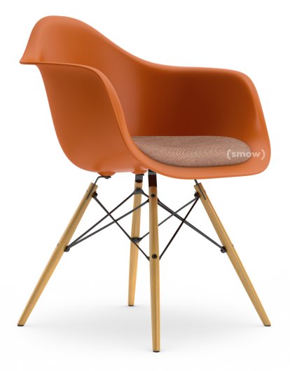 Eames Plastic Armchair RE DAW, Rostorange, Mit Sitzpolster, Cognac / elfenbein, Standardhöhe - 43 cm, Esche honigfarben