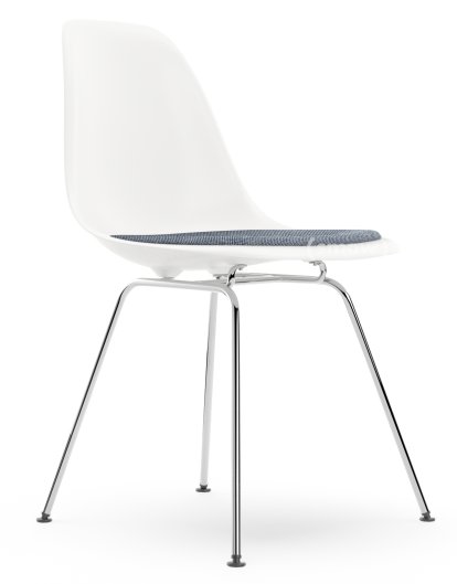 Eames Plastic Side Chair RE DSX, Weiß non-RE, Mit Sitzpolster, Dunkelblau / elfenbein, Standardhöhe - 43 cm, Verchromt