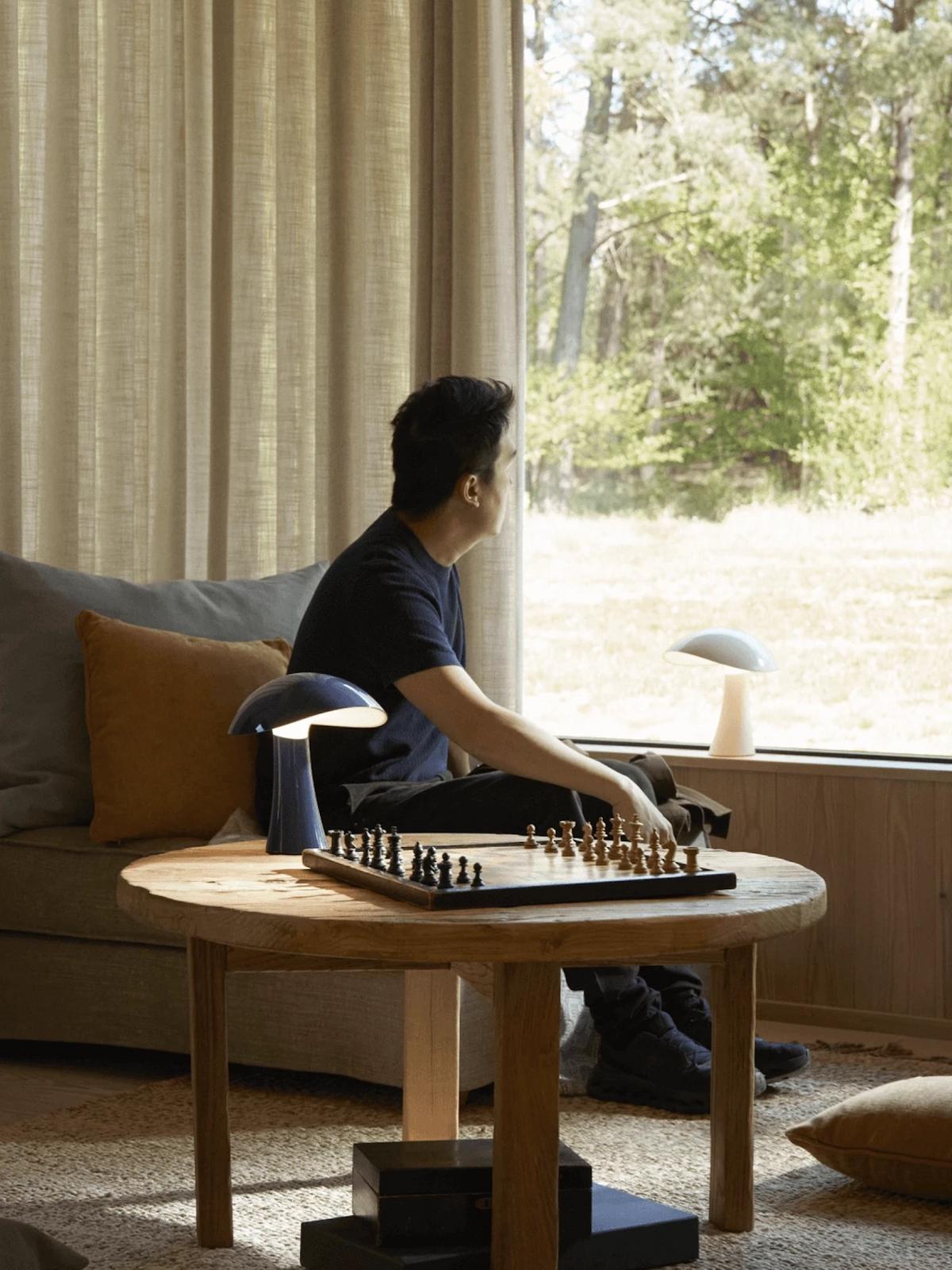 Gabriel Tan mit seiner Rumee Tischleuchte von Louis Poulsen