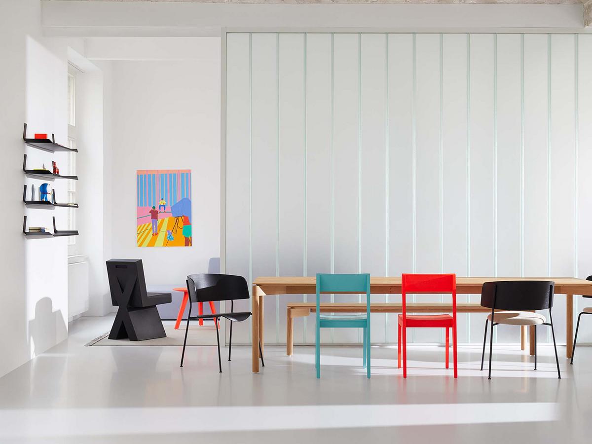 Die Designsprache von Objekte unserer Tage ist so prägnant, dass man die Möbelstücke auch ohne Logo identifizieren kann: klare, grafische Linien, kräftige, selbstbewusste Farben und bewusst irritierende Silhouetten, wie beispielsweise die des Schulz Stuhls mit seinen markant geneigten Beinen. Typisch für OUT sind nicht nur die geneigten Beine, die den Möbeln eine leichte Bewegung verleihen, sondern auch die traditionellen Produktnamen (Meyer, Wagner, Schulz), die im Kontrast zum urbanen, modernen Look der Möbel stehen.