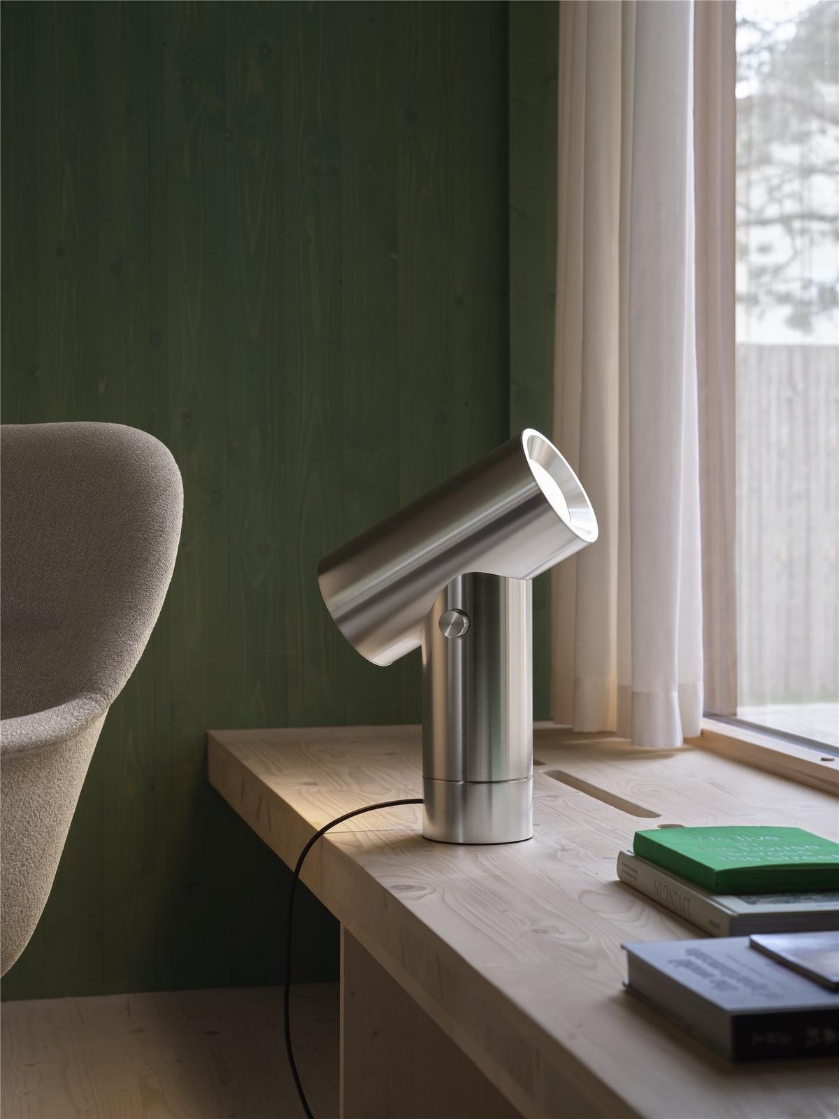 Beam Tischleuchte aus poliertem Aluminium: minimalistisch von außen, vielseitig und funktional im Kern