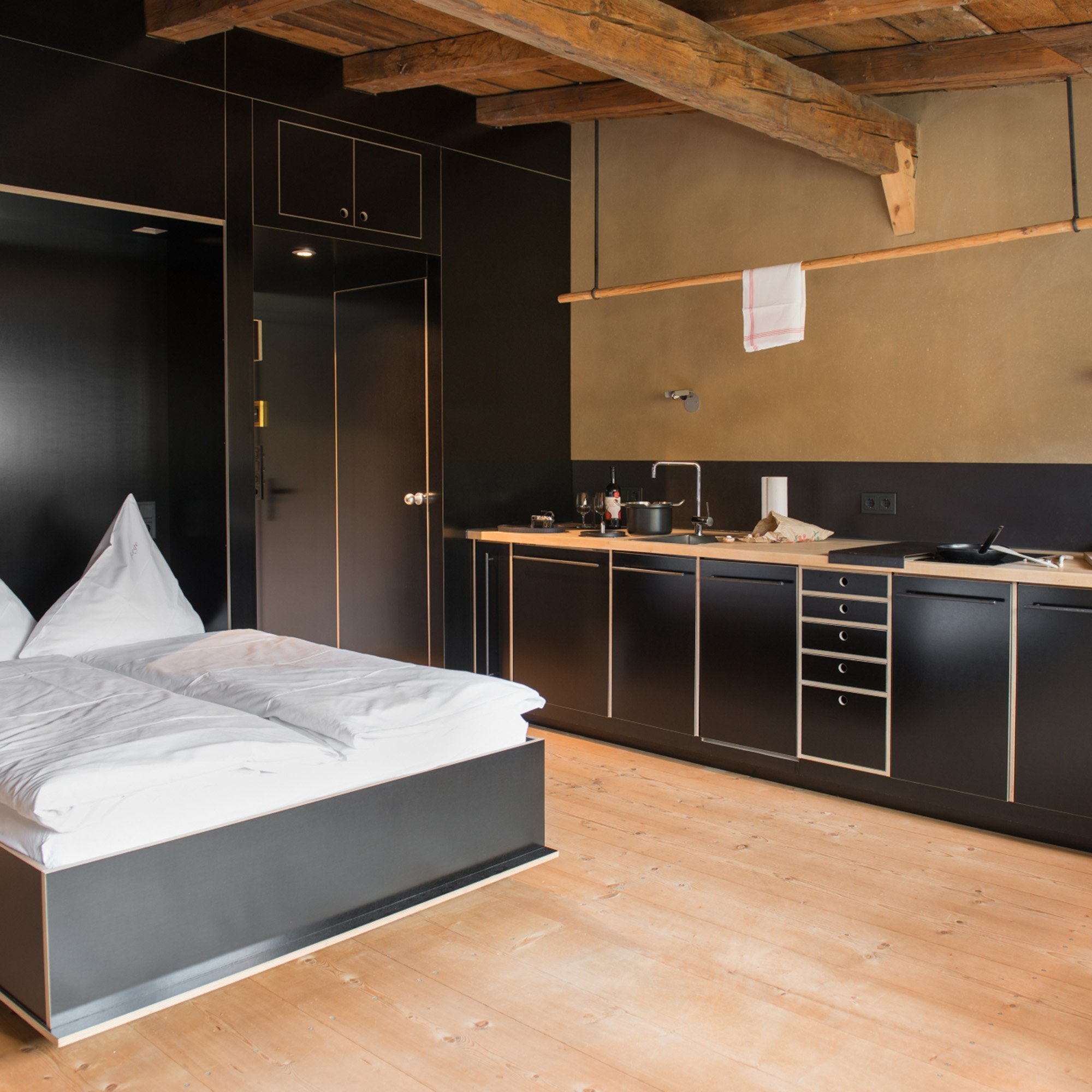 In Aschau im Chiemgau, wo man von Kuhglocken geweckt wird und die Welt noch in Ordnung ist, steht das Gästehaus berge von Nils Holger Moormann. Dabei finden hier lange nicht nur Naturburschen eine Unterkunft, denn das Haus ist mit Produkten ausgestattet, die wenig bis gar nicht vom bayrischen Bergland zeugen. Moormann und sein Team stehen für qualitativ hochwertige Holzmöbel made in Germany und kooperieren der Nachhaltigkeit zuliebe mit regionalen Zulieferern. Wem das an Authentizität noch nicht reicht, der kann vor dem Möbelkauf im berge probewohnen. Ursprünglich als Lagerhalle vorgesehen, bietet die Herberge seit 2009 individuell gestaltete und mit Moormann Möbeln eingerichtete Zimmer mit so beschaulichen Namen wie "Kampenblick", "Bergfried" oder "Winterstube". Knarzende Dielen, Lehmputz- und offene Steinwände treffen hier auf moderne Glaselemente und schaffen gemeinsam mit der warmen Holzeinrichtung eine wohnliche Atmosphäre ohne Schnickschnack. Ein Restaurant gibt es im berge nicht, in den Küchen der Apartments lassen sich jedoch zünftige Mahlzeiten zubereiten - Geheimtipps für die besten regionalen Spezialitäten gibt es inklusive!