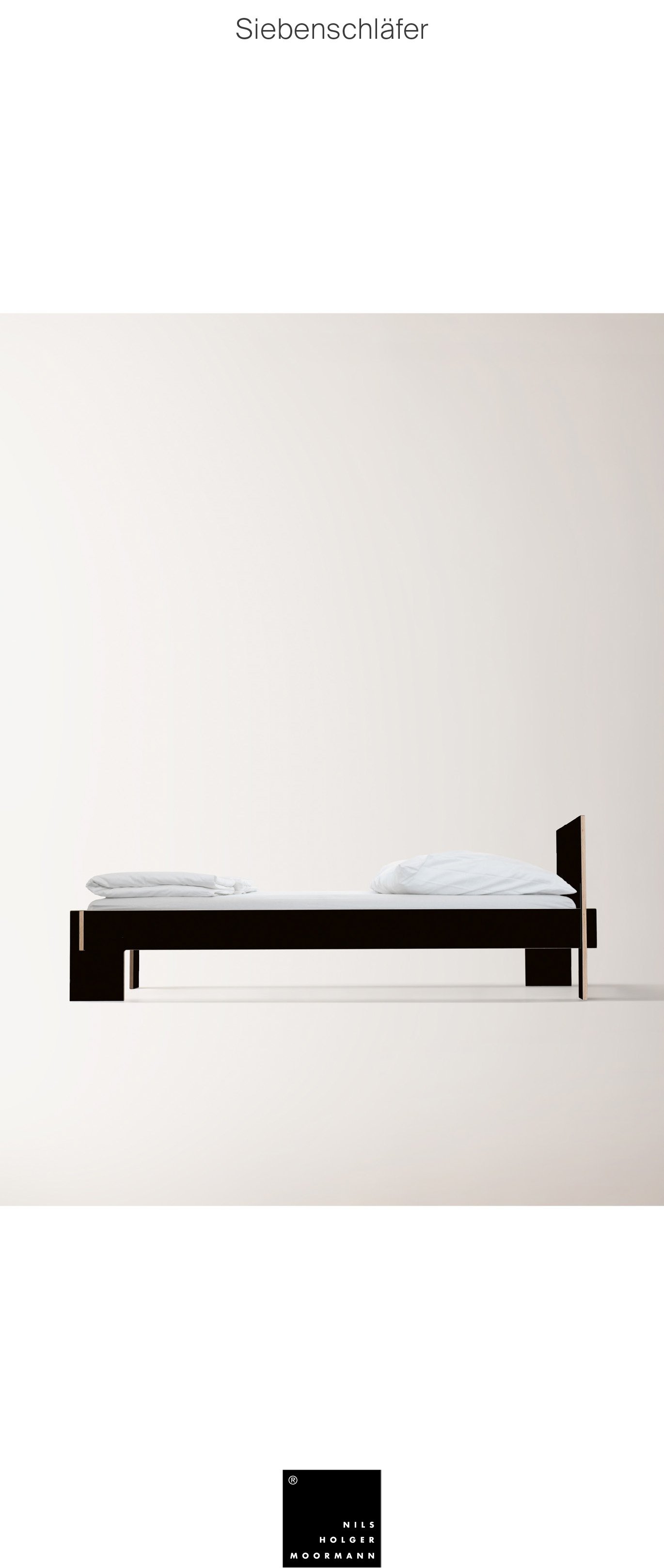 Eines der einprägsamsten Bettendesigns der jüngeren Zeit ist Moormanns Siebenschläfer. Ganz ohne Schrauben erhält das Bett Siebenschläfer allein durch ein simples Steckprinzip seine Stabilität. Mit klarem Design, unterschiedlichen Maßen, verschiedenen Farben und optionalem Kopfteil sowie mit einer ebenfalls von Nils Holger Moormann hergestellten passenden Seitenablage wird das Siebenschläfer Bett zur persönlichen Traumlandschaft.