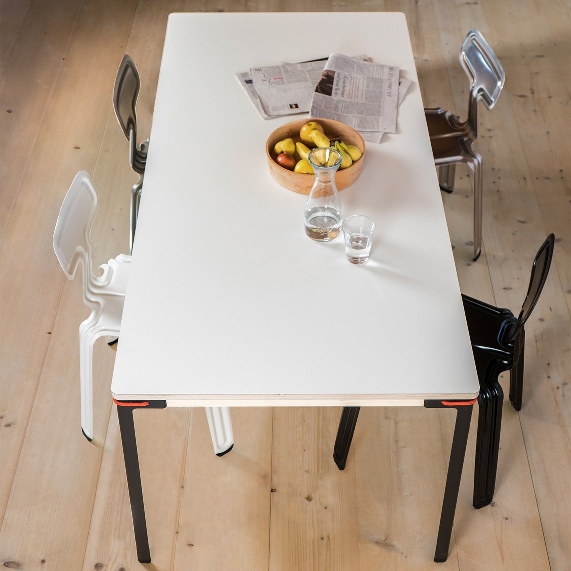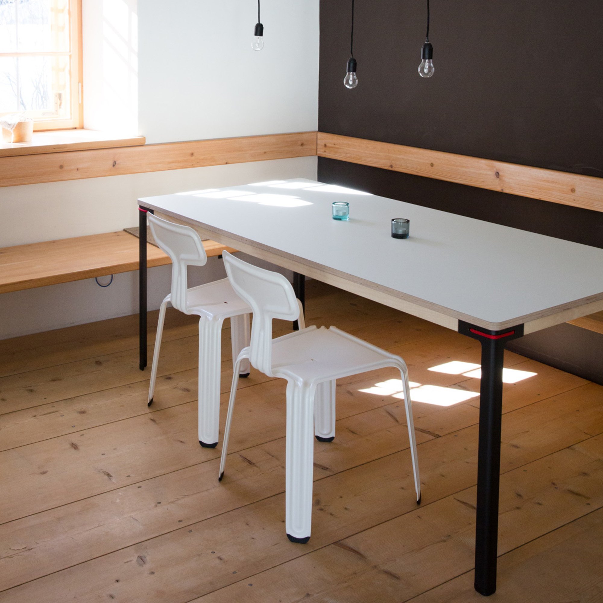 Eine absolute Besonderheit sind auch die Moormann Tischplatten: die drei Plattenoberflächen Melaminharz, Laminat und Linoleum sind widerstandsfähig, zeichnen sich durch ihre jeweils ganz eigene Haptik aus und sind in unterschiedlichen Farbtönen erhältlich. Zwar hat der Hersteller eine Vorliebe für schwarz, bei voraussichtlich starker Beanspruchung – das heißt, sollte es doch mal einen Kratzer geben – empfiehlt Moormann allerdings helle Oberflächen.