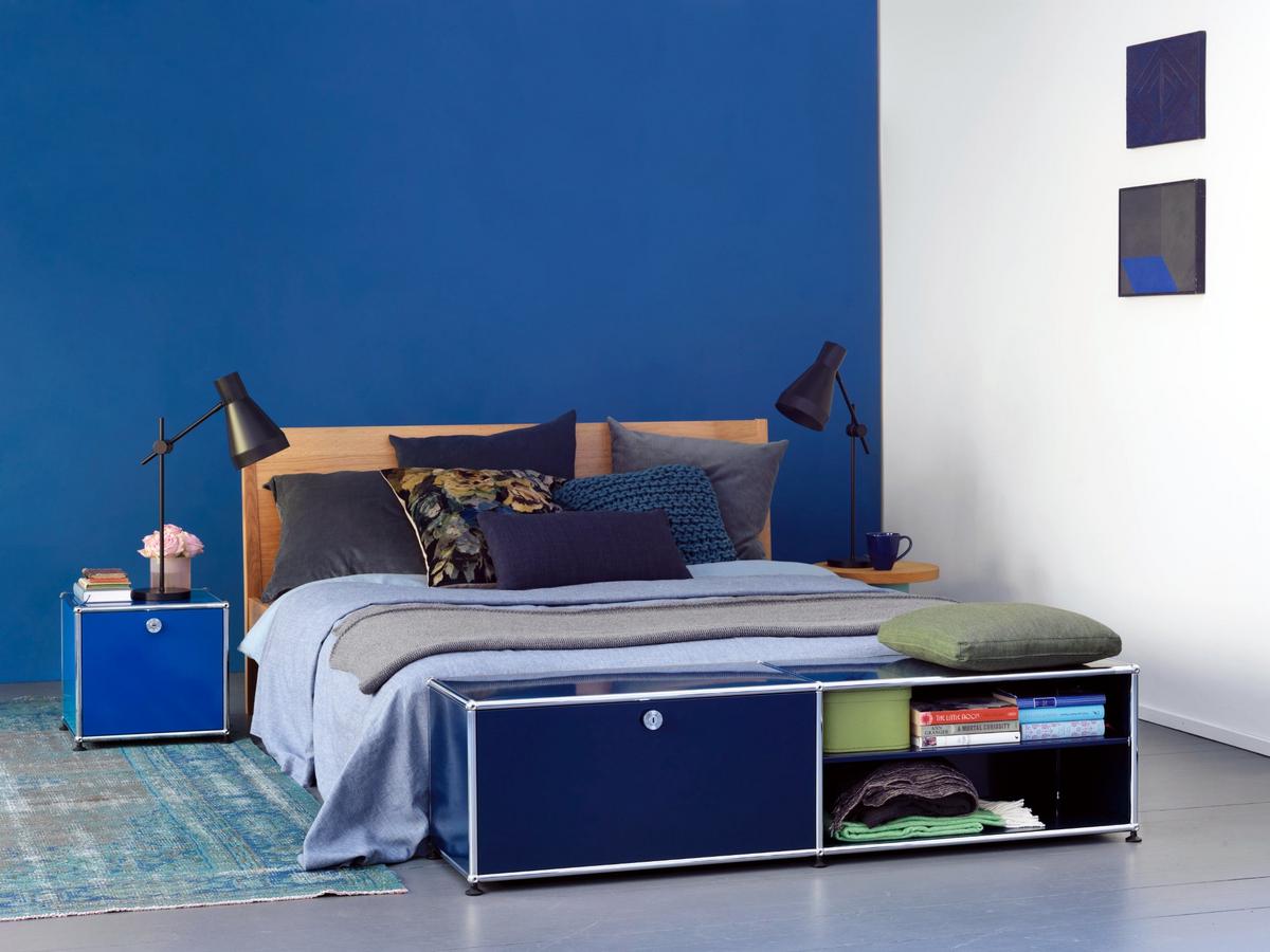 Für das Schlafzimmer gilt: Betten können schlicht oder verschnörkelt sein, doch zu einem USM Haller Nachttisch passt am besten ein schnörkelloses Holzbett im Industrial Style mit klaren Linien – das unterstreicht die Geradlinigkeit der Möbel und schafft eine stilvolle, harmonische Atmosphäre. Ein USM Haller Lowboard L bildet den idealen Abschluss am Fußende mit jeder Menge Stauraum.
