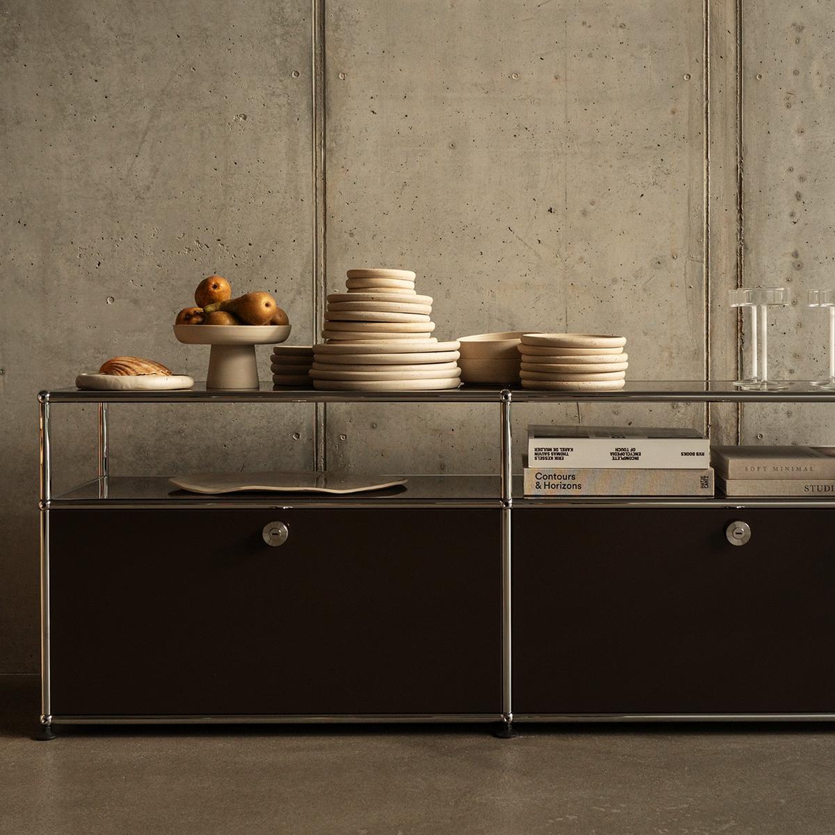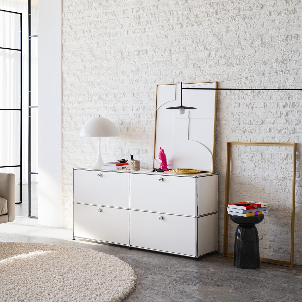 Eine häufige Frage lautet: Welche Möbel passen zu USM Haller Regalen? Die Antwort: Fast alle Oberflächen und Einrichtungsstile lassen sich mit den chromfarbenen Möbeln kombinieren. Die schlichte Eleganz eines USM Haller Metallmöbels harmoniert hervorragend mit Design- und Vintage-Möbeln. Probieren Sie verschiedene Kombinationen aus und lassen Sie Ihrer Kreativität freien Lauf.