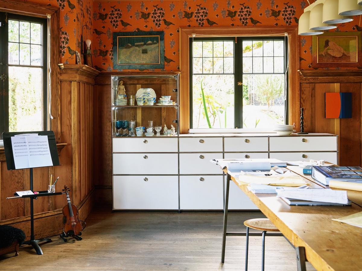 ...Ein besonderer Blickfang ist die Farbe Orange – ein durchgehender, leuchtender Akzent, der sich in den Wandbildern von Amelie und Alan sowie im USM Haller Servierwagen widerspiegelt...