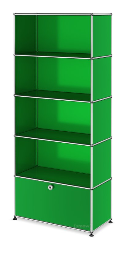 Die Geschichte des USM Aktenregals, des USM Haller Sideboards genau wie aller anderen USM Möbel beginnt Anfang der 1960er Jahre, als der Schweizer Betrieb USM in ein modernes Industrieunternehmen umstrukturiert werden soll. Der damalige Firmeninhaber, Paul Schärer, beauftragte damals den Architekten Fritz Haller mit der Planung neuer Betriebsanlagen. Nach Fertigstellung der Neubauten entwickelte Fritz Haller dann im Jahr 1963 das USM Möbelbausystem als Inneneinrichtung für den USM Büropavillon in Münsingen. Ursprünglich nur für den firmeneigenen Bedarf konzipiert, ging USM Haller sechs Jahre später, nach der Ausstattung der Pariser Rothschild Bank, in Serienproduktion. Das Besondere der USM Haller Regale ist heute wie damals die modulare Konzeption: aus gerade einmal drei Grundelementen können Möbel in beinahe allen erdenklichen Formen konstruiert werden. In die Grundstruktur aus verchromten Metallrohren, die mit ebenfalls verchromten Metallkugeln verbunden sind, werden Tablare aus Metall oder Glas eingesetzt. Schließlich kann das Möbel mit verschiedenem Zubehör, wie Türen, Rollen, Schlössern und Zwischentablaren, ausgestattet werden. Das individuell konfigurierbare USM Aktenregal mit Klappen/Auszügen verfügt über fünf Fächer, die wahlweise mit Klappen oder Auszügen ausgestattet werden können.