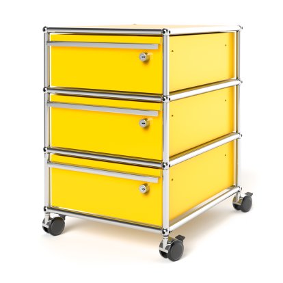 USM Haller Rollcontainer mit 3 Schubladen Typ 1 (mit Gegengewicht), Alle Fächer mit Schloss, Goldgelb RAL 1004