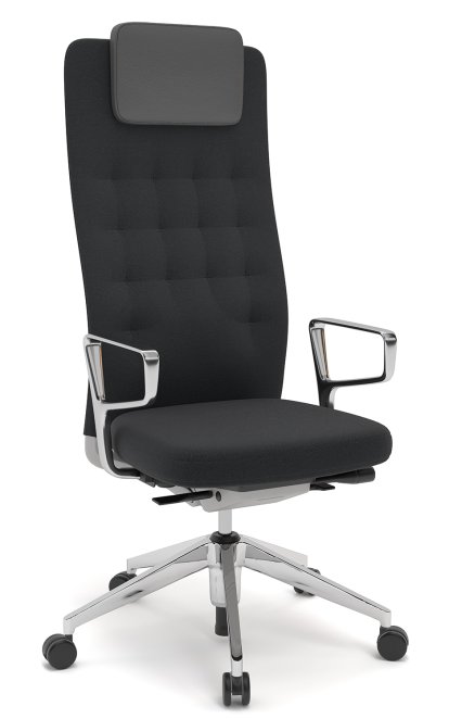 Besonders charakteristisch ist die hohe Rückenlehne des ID Trim L, die auch bei weitem Zurücklehnen ein angenehmes Sitzen ermöglicht. Die abgesteppten Polster lassen die Lehne elegant wirken, verhindern aber auch, dass der Bezug verrutscht. Der Vitra ID Trim L ist mit verschiedenen Stuhlmechaniken lieferbar, entweder in der FlowMotion-Ausführung ohne Vorwärtsneigung mit Sitztiefenverstellung, in der FlowMotion-Ausführung ohne Sitztiefenverstellung oder als ProMatic-Version ohne Sitztiefenverstellung. Die ProMatic-Mechanik passt sich dem Gewicht des Einzelnen an und eignet sich damit ideal für Nutzer, die den Vitra ID Trim L Drehstuhl kurz bis mittelfristig als Sitzgelegenheit in Anspruch nehmen möchten. Das gilt insbesondere auch für Konferenz- und Besprechungsbereiche. Die FlowMotion-Mechanik beinhaltet zahlreiche Funktionen und kann so individuell den Anforderungen des Nutzers angepasst werden. Diese Stuhlmechanik eignet sich demnach für einen festen Arbeitsplatz und eine längere Verweildauer. Des Weiteren bilden die integrierte Lumbalstütze und das Kopfteil eine Unterstützung für den Nutzer. Der ID Trim L von Vitra ist, wie die anderen ID Chairs, mit unterschiedlichen Armlehnen erhältlich. Auch in puncto Farbe ist der ID Trim L besonders vielseitig, so hat der Management Chair mit der markanten Rückenlehne das Potential zum Kernstück jedes Businessbereichs zu werden.