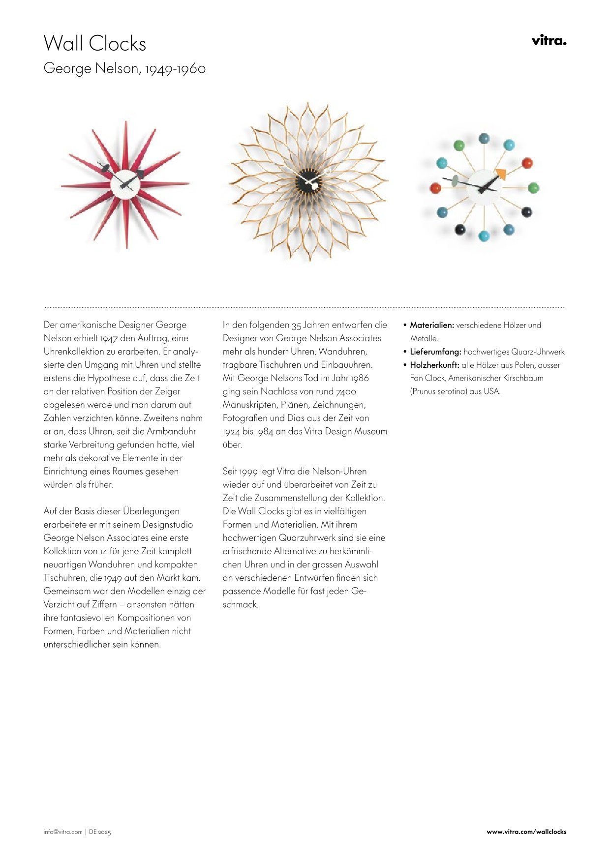 Die Miller Clock Company stellte die Auflage der Nelson Wallclocks ein, Vitra nahm sie in den 1990er Jahren auf - eine Bereicherung für die Nelson Kollektion des Herstellers. Die europäische Verbreitung vieler amerikanischer Mid-Century-Entwürfe ist Vitra zu verdanken; analog zu den George Nelson Wanduhren sind etwa auch die Ideen von Ray & Charles Eames mit Hilfe des Schweizer Unternehmens zu Klassikern avanciert. Das Ideal, Alltagsgegenständen einen Wert zu verleihen, um Alltagswerte zu erschließen, verwirklicht Vitra jedoch nicht nur durch die Realisierung von Designklassikern. Der Möbelhersteller ist auch aktiv an der Kreation neuer, hochwertiger Designs beteiligt, in Kooperation mit zeitgenössischen Gestaltungstalenten wie Jasper Morrison oder Hella Jongerius. Darüber hinaus dokumentiert Vitra mit seinem Design Museum wichtige und einflussreiche Konzepte und macht sie für die Öffentlichkeit zugänglich.