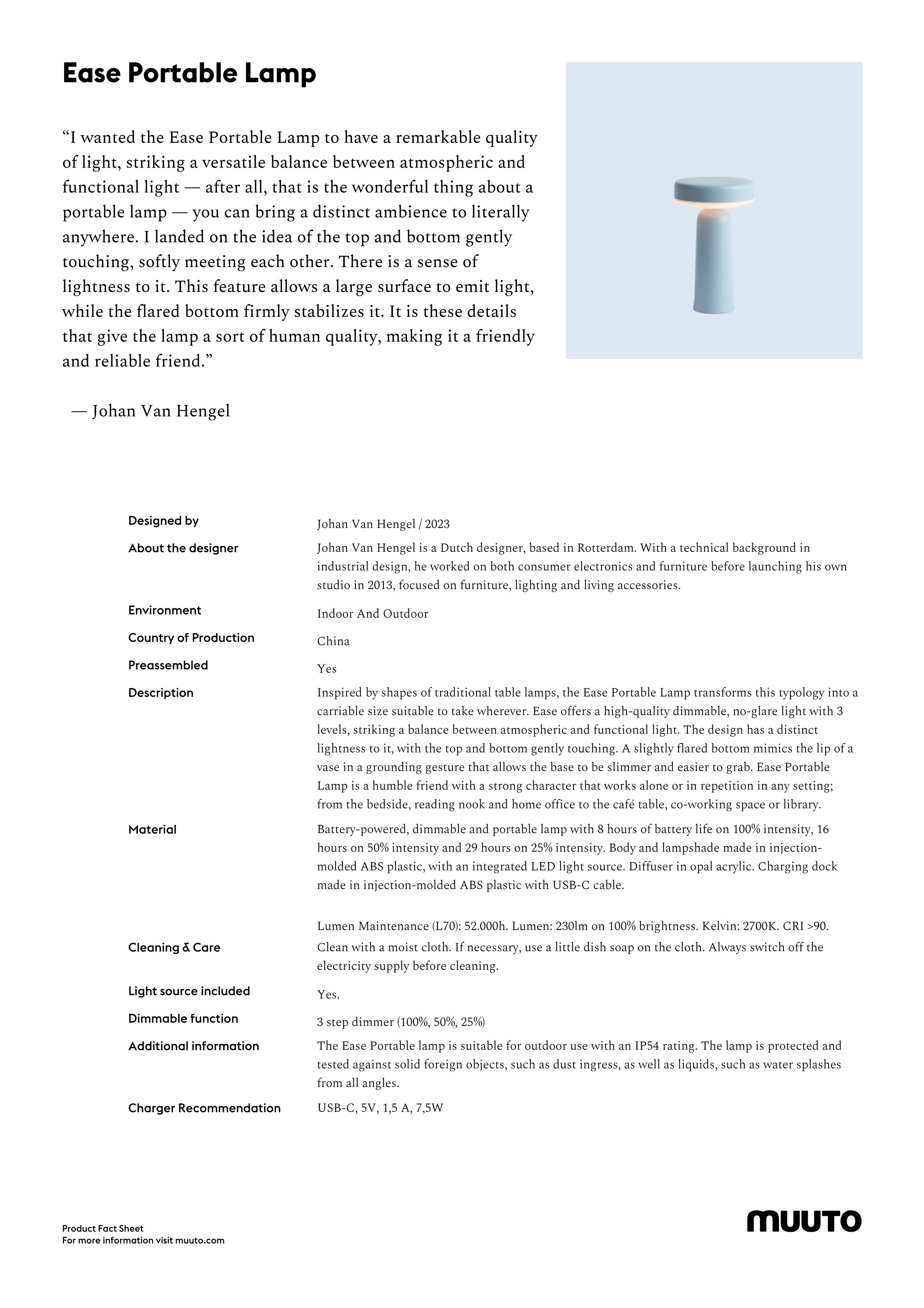 Das Design der Ease Akkuleuchte von Muuto zeichnet sich durch eine ausgeprägte Leichtigkeit aus. Durch sein dimmbares Licht mit 3 Stufen wird ein Gleichgewicht zwischen stimmungsvollem und funktionellem Licht geschaffen. Vom Nachttisch, auf den Balkon, hin zum Co-Working-Space - die Ease Portable lässt sich im Innen- oder Außenbereich vielseitig einsetzen.