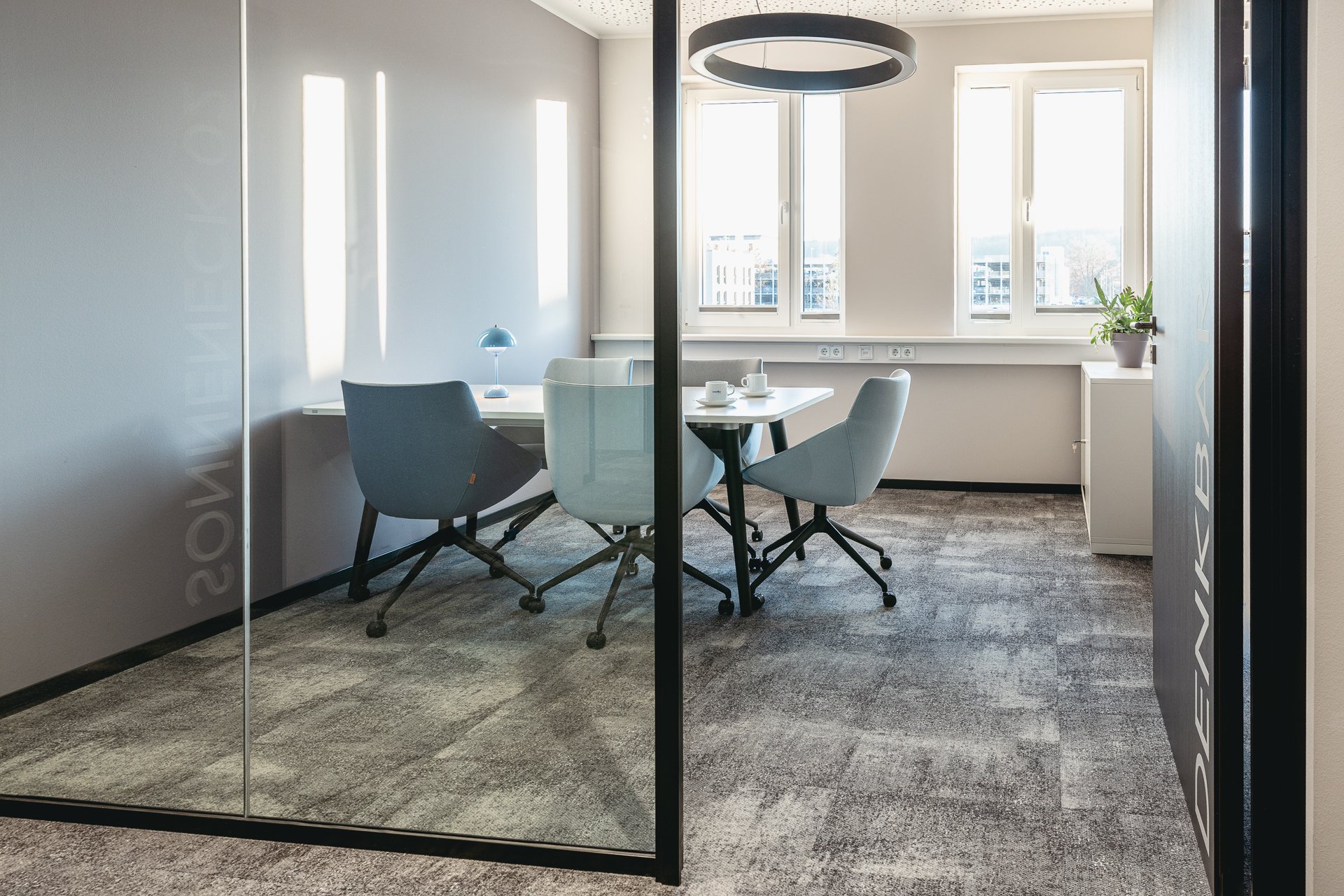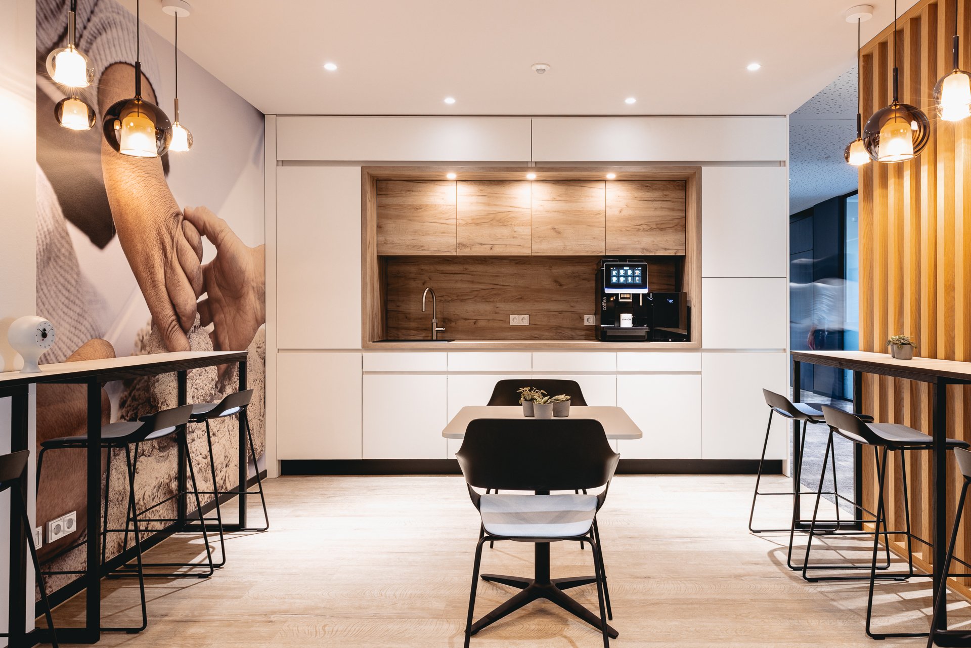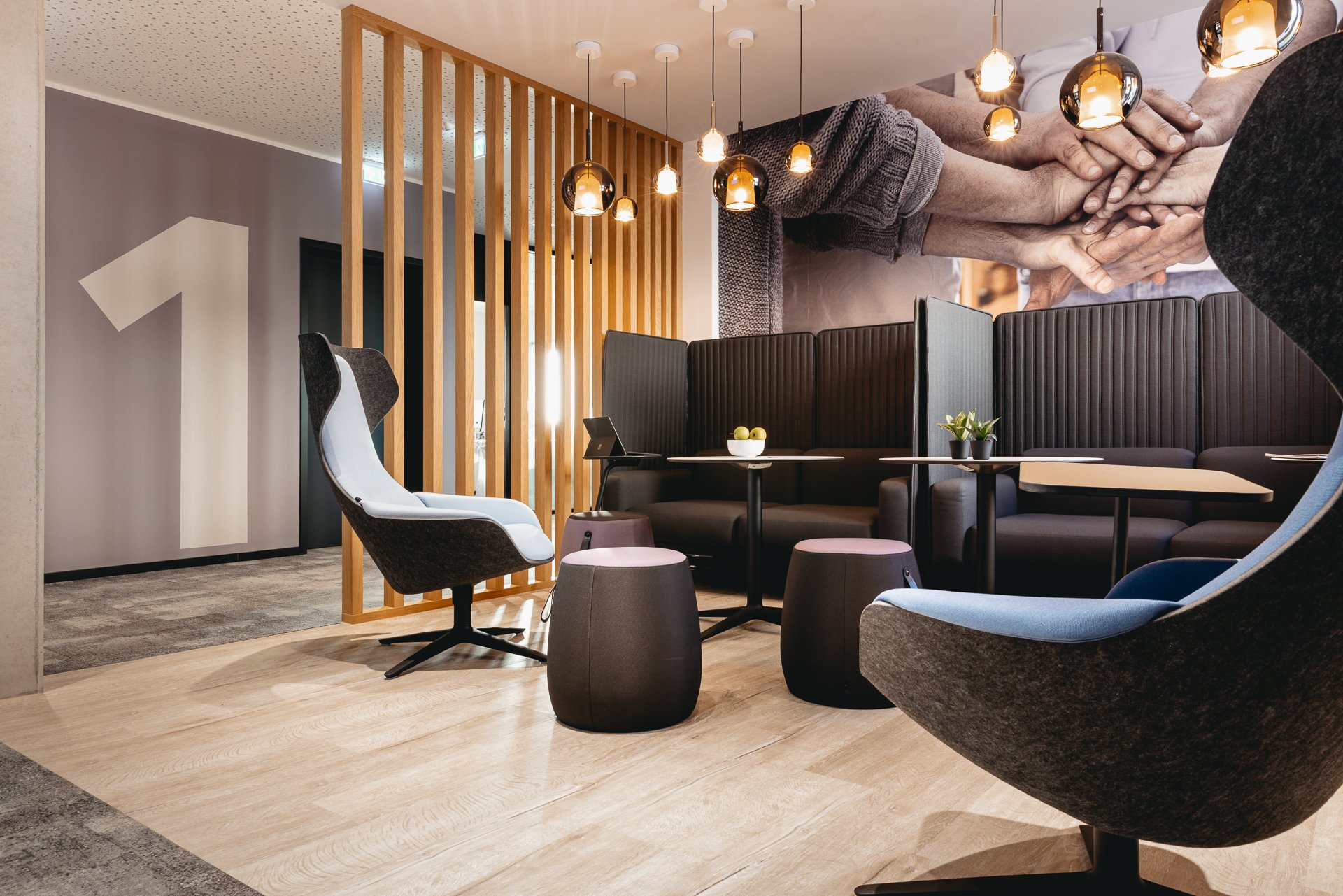Begegnungszonen auf jeder Etage fungieren als bewusst gestaltete kommunikative Knotenpunkte. Die klassische Zellenstruktur wurde zugunsten von mehr Transparenz und dem Abbau optischer Barrieren durch großflächige Verglasungen aufgebrochen und durch Folierungen mit unternehmensbezogenen Grafiken individuell gestaltet.