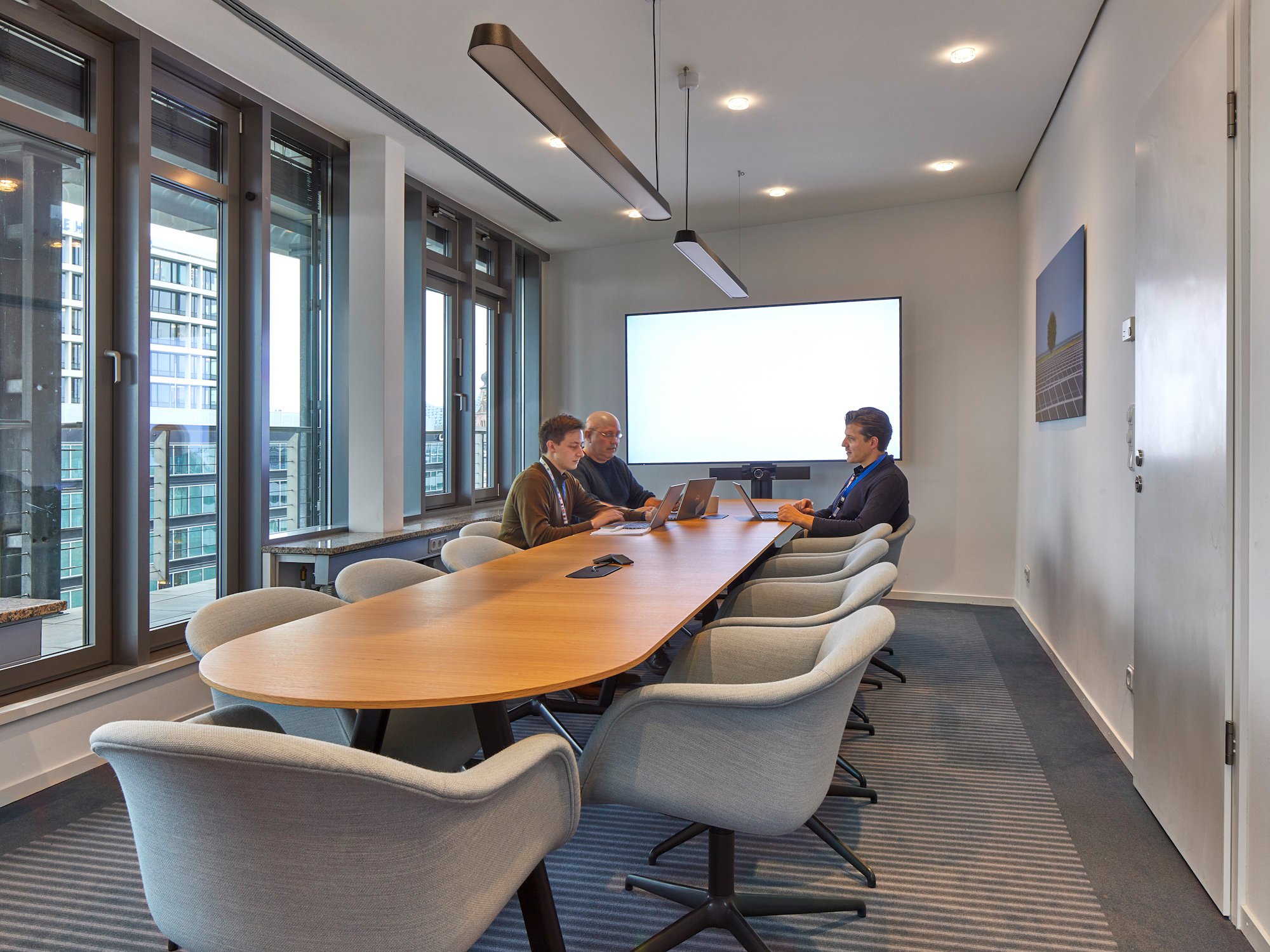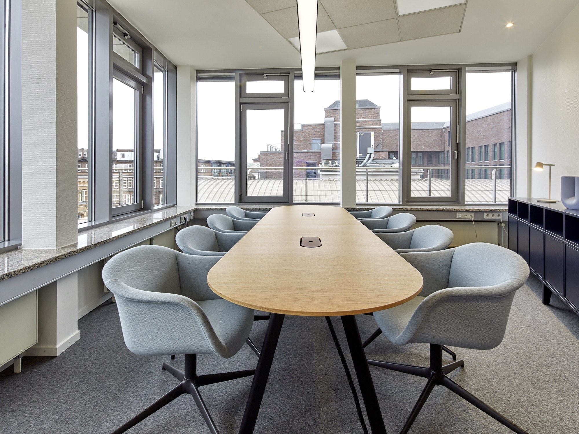 Zusätzlich stellte der Meetingraum, der besonders für Termine mit externen Gästen genutzt wird, aufgrund seines ungewöhnlich schmalen Grundrisses eine planerische Herausforderung dar. Die Möblierung musste so gewählt werden, dass trotz der begrenzten Breite genügend Bewegungsfreiheit im Raum gewährleistet blieb, ohne die Funktionalität einzuschränken. Die Lösung bot hier ein besonders schmaler Sitzungstisch von Renz.