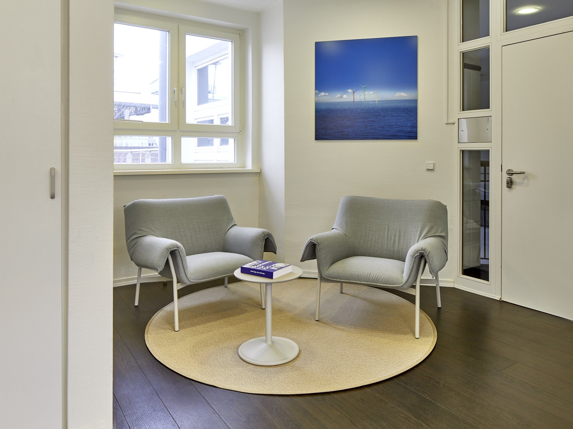 Entstanden ist eine vielseitige Arbeitsumgebung, die sowohl klassische Zweier-Büros als auch offene Open-Space-Bereiche umfasst. Ein einladender Empfang mit Wartebereich sorgt für einen professionellen ersten Eindruck, während verschiedene Meetingräume für interne und externe Besprechungen zur Verfügung stehen. Ergänzt wird das Konzept durch eine Küche als zentralen Treffpunkt für den informellen Austausch. Um eine inspirierende und attraktive Arbeitsatmosphäre zu schaffen, wurde besonderer Wert auf ein frisches Farbkonzept sowie eine ausgewogene Mischung hochwertiger Designmöbel von Herstellern wie Bene, Vitra und Muuto gelegt. So bietet der neue Standort nicht nur funktionale, sondern auch ästhetisch ansprechende Arbeitswelten, die den hohen gestalterischen Anspruch der Kontaktpersonen von eine Energiegesellschaft vor Ort widerspiegeln.