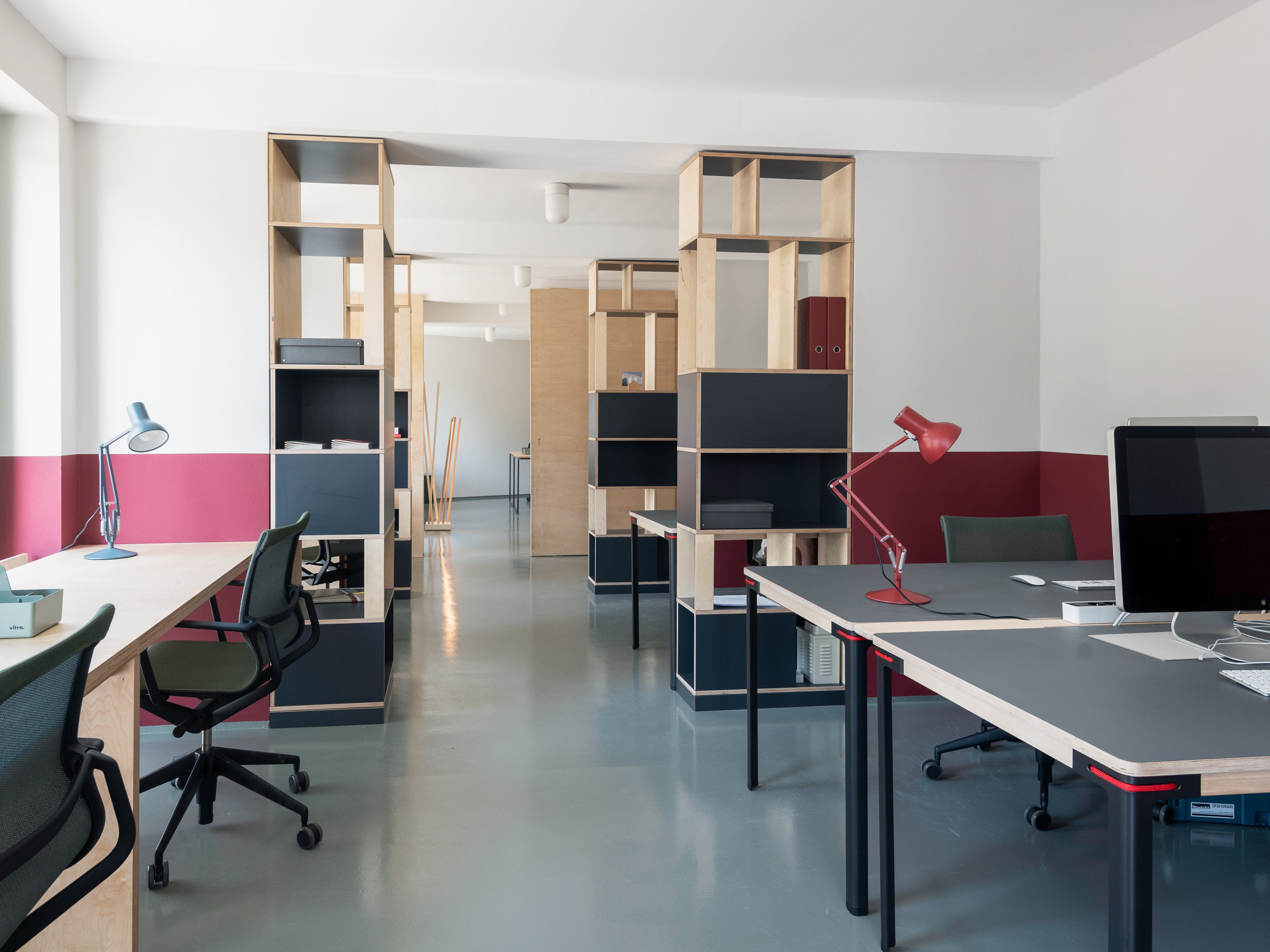 Eingerichtete Bereiche: Besprechungsraum, Workshopraum, Eingangsbereich, Arbeitsplätze