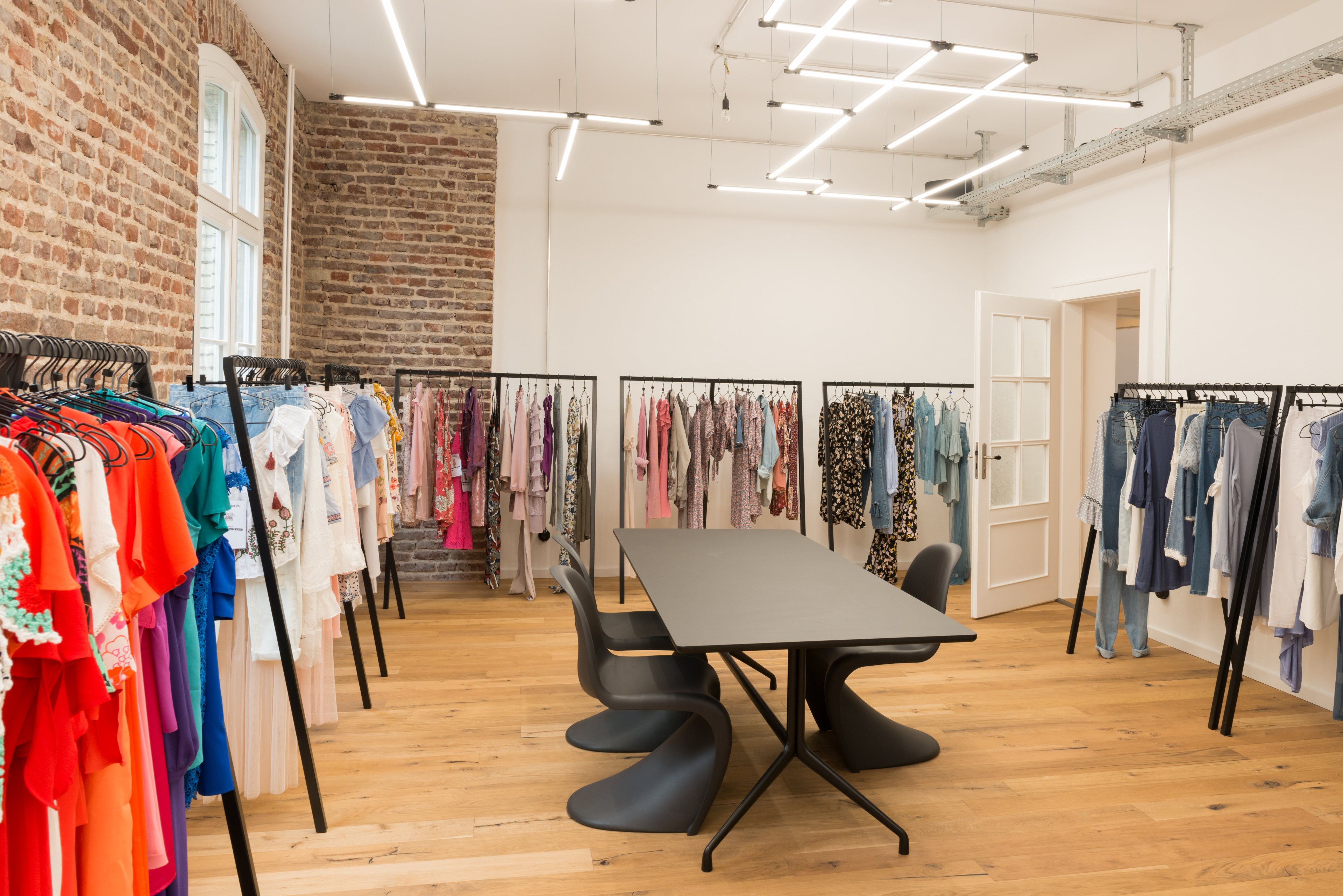 Eingerichtete Bereiche: Ausstellungsfläche für Mode und Accessoires; Office-Arbeitsplätze in der Ausstellungsfläche und separierte Büros
