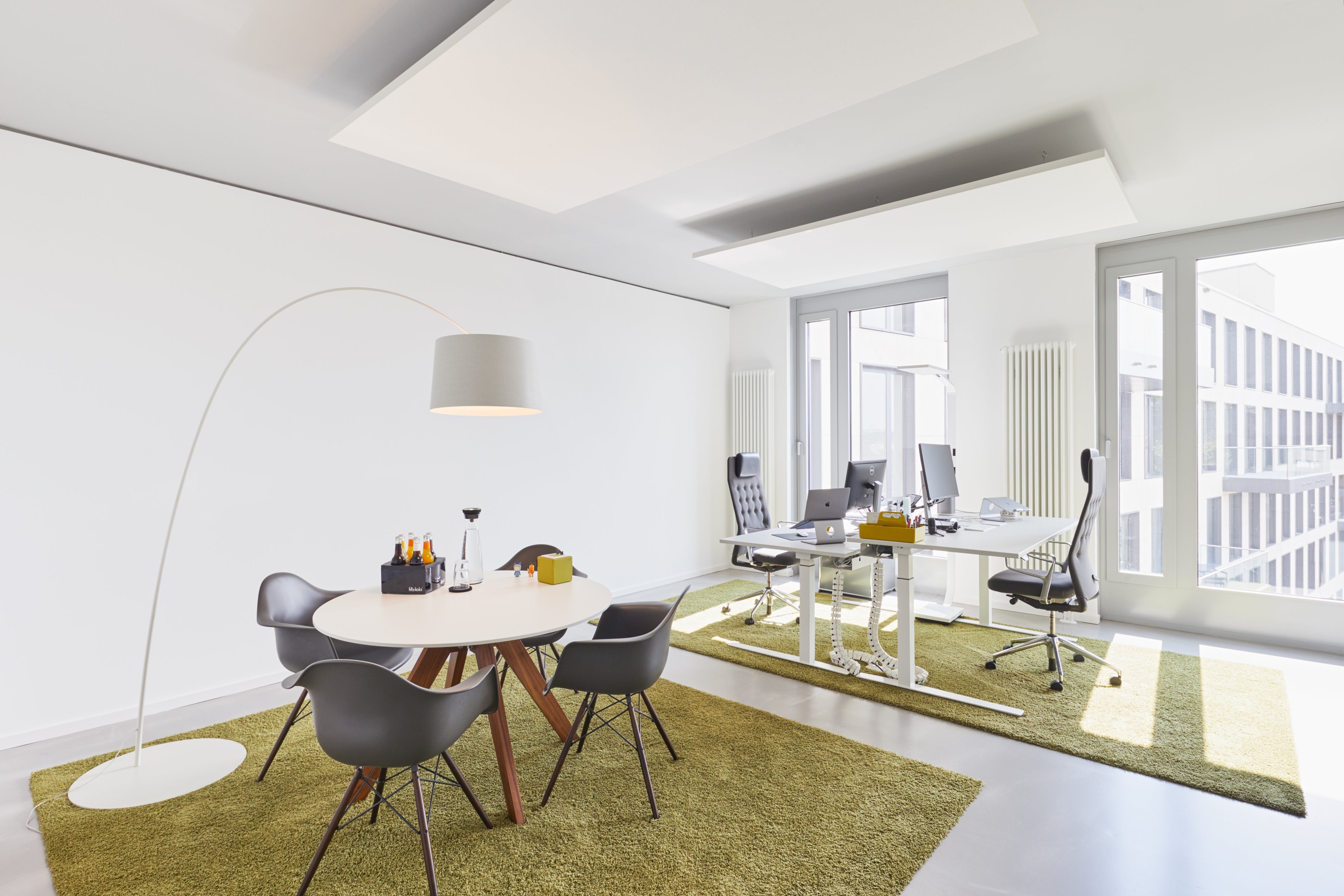 Um den Ansprüchen an Kreativität und Flexibilität gerecht zu werden, wurde beispielsweise auf feste Arbeitsplätze verzichtet. Die Mitarbeiter können täglich individuell je nach Aufgabe und Stimmung ihren Patz wählen. Der Wohlfühlfaktor steht im Vordergrund. Optisch prägt dabei ein Mix aus Designklassikern und jungen Marken die Arbeitsumgebung, die nicht als Ausstellung, sondern erlebbare und einladende Fläche von den Kunden wahrgenommen werden soll.