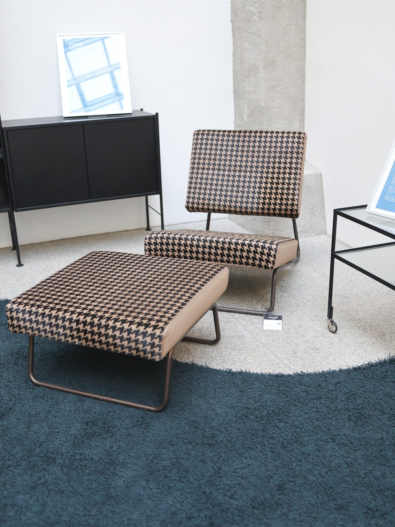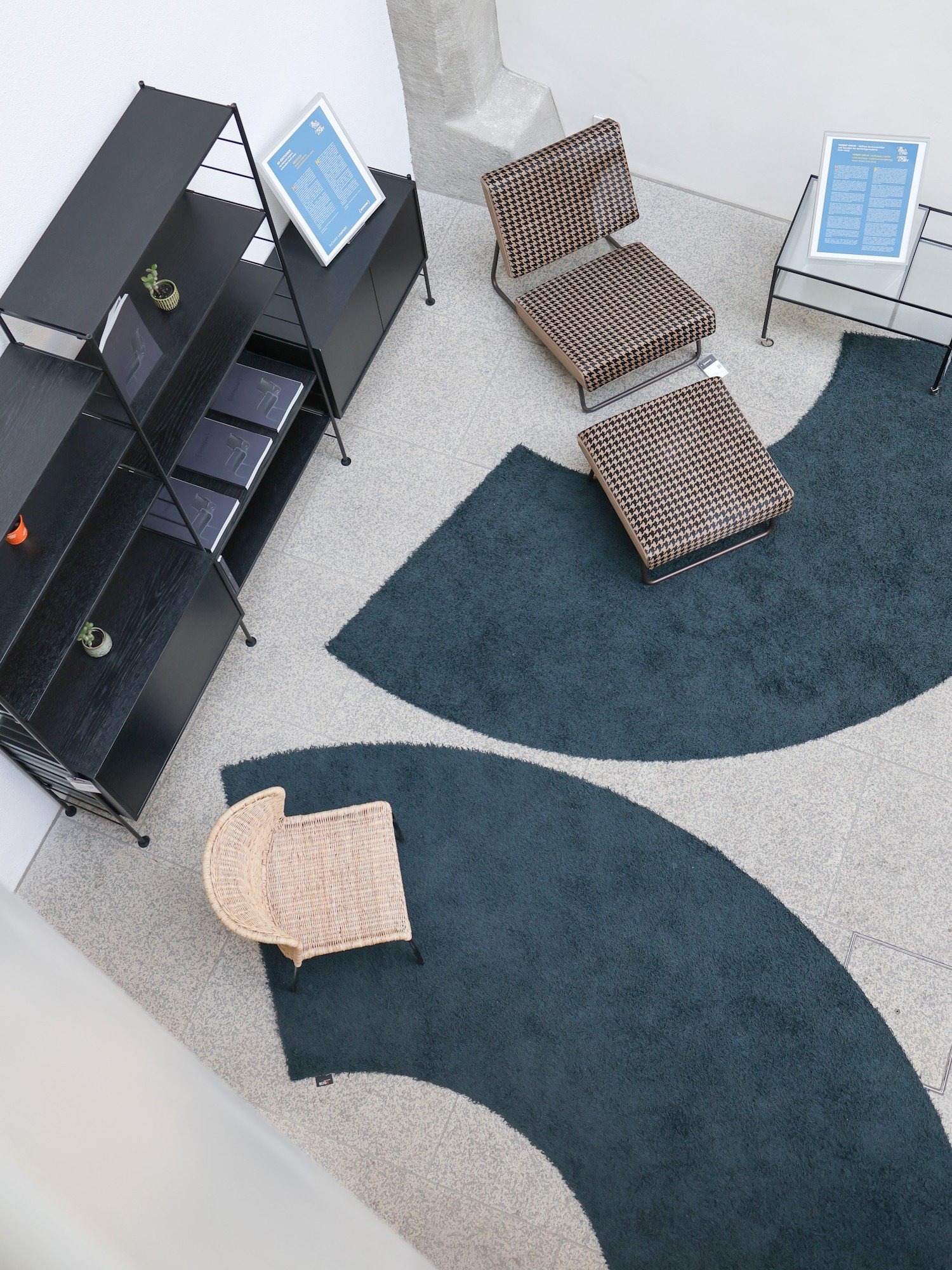 Die kleinen Teppiche in der smow-Klammerform waren hier keine einschließenden Elemente, sondern richteten sich entgegengesetzt zueinander: Sie setzten subtile Akzente, beinahe wie ein räumlicher Verweis auf die zusätzliche erzählerische Ebene der Ausstellung „UmBrüche 1945“, und betonten die Verbindung zwischen Möbeldesign, Architektur und historischer Kontextualisierung. Die freigestellte Anordnung der Möbel erlaubte es, ihre filigranen Proportionen, die klare Formensprache und die charakteristische Ästhetik Hirches besonders deutlich wahrzunehmen, ohne den musealen Charakter des Lichthofs zu stören.